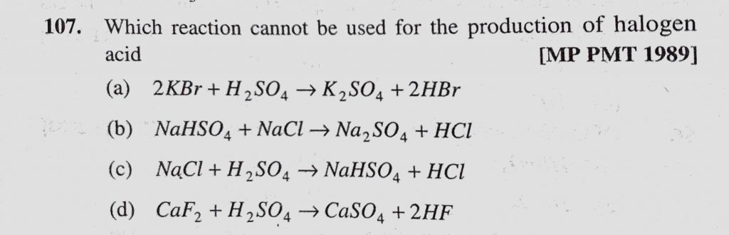 Which reaction cannot be used for the production of halogen acid (a) 2KBr + H2SO4 to K2SO4 + 2 HBr Which reaction cannot be used for the production of halogen acid (a) 2KBr + H2SO4 to K2SO4 + 2 HBr November 24, 2020 Category: Uncategorised (JEE Advanced Physics by BM Sharma + GMP Solutions) , Facebook Messenger WhatsApp Share this:TwitterFacebook Related
