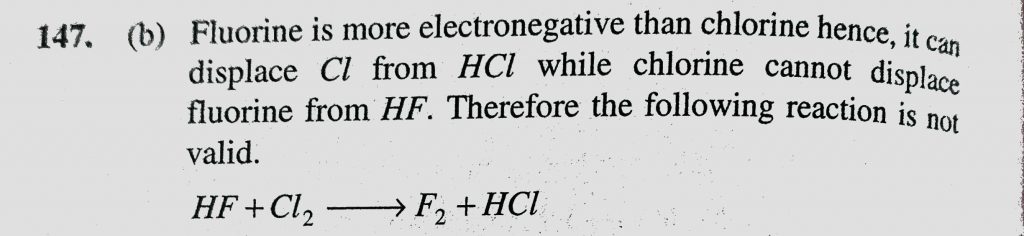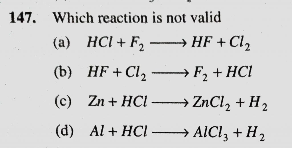 Which reaction is not valid (a) HCl + F2 to HF + Cl2 (b) HF + Cl2 to F2 + HCl Which reaction is not valid (a) HCl + F2 to HF + Cl2 (b) HF + Cl2 to F2 + HCl November 25, 2020 Category: Uncategorised (JEE Advanced Physics by BM Sharma + GMP Solutions) , Facebook Messenger WhatsApp Share this:TwitterFacebook Related