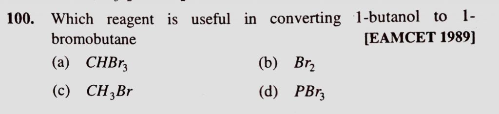 Which reagent is useful in converting 1-butanol to 1- bromobutane (a) CHBr3 (b) Br2 (c) CH3Br (d) PBr3 Which reagent is useful in converting 1-butanol to 1- bromobutane (a) CHBr3 (b) Br2 (c) CH3Br (d) PBr3 February 13, 2021 Category: Uncategorised (JEE Advanced Physics by BM Sharma + GMP Solutions) , Facebook Messenger WhatsApp Share this:TwitterFacebook Related