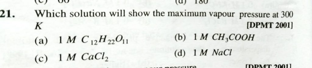 Which solution will show the maximum vapour pressure at 300 K (a) 1 M C12 H22 O11 (b) 1 M CH3COOH (b) 1 M CaCL2 (d) 1 M NaCL Which solution will show the maximum vapour pressure at 300 K (a) 1 M C12 H22 O11 (b) 1 M CH3COOH (b) 1 M CaCL2 (d) 1 M NaCL December 12, 2020 Category: Uncategorised (JEE Advanced Physics by BM Sharma + GMP Solutions) , Facebook Messenger WhatsApp Share this:TwitterFacebook Related
