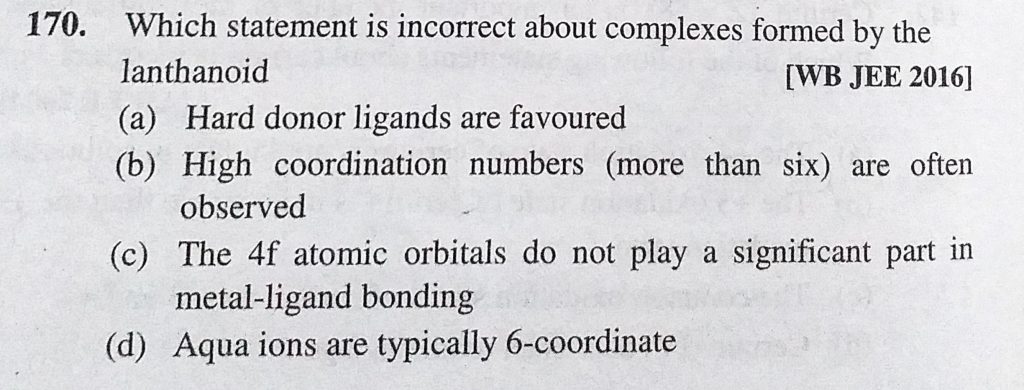 Which statement is incorrect about complexes formed by the lanthanoid (a) Hard donor ligands are favoured Which statement is incorrect about complexes formed by the lanthanoid (a) Hard donor ligands are favoured November 30, 2020 Category: Uncategorised (JEE Advanced Physics by BM Sharma + GMP Solutions) , Facebook Messenger WhatsApp Share this:TwitterFacebook Related