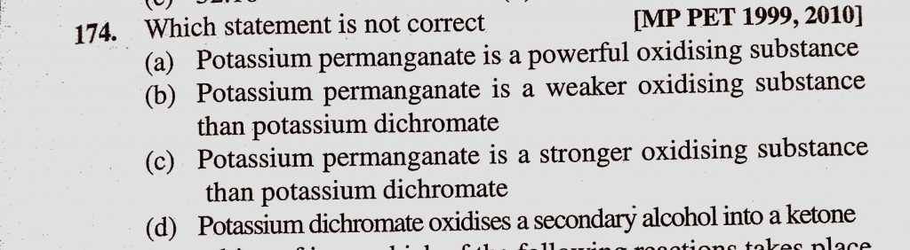 Which statement is not correct (a) Potassium permanganate is a powerful oxidising substance (b) Potassium permanganate is a weaker oxidising substance than potassium dichromate Which statement is not correct (a) Potassium permanganate is a powerful oxidising substance (b) Potassium permanganate is a weaker oxidising substance than potassium dichromate December 2, 2020 Category: Uncategorised (JEE Advanced Physics by BM Sharma + GMP Solutions) , Facebook Messenger WhatsApp Share this:TwitterFacebook Related