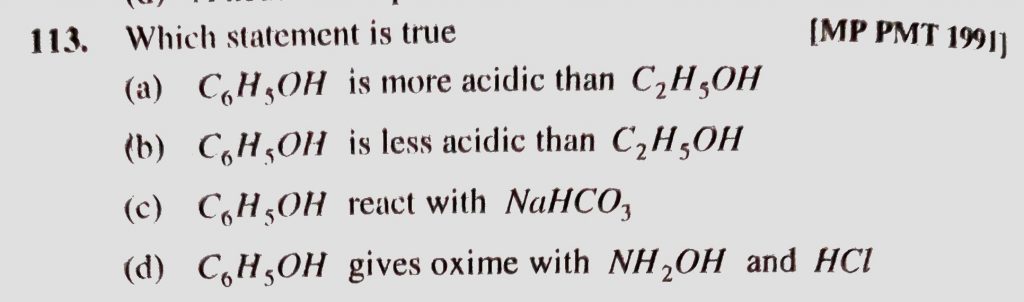 Which statement is true (a) C6H5OH is more acidic than C2H5OH (b) C6H5OH is less acidic than C2H5OH (c) C6H5OH react with NaHCO3 (d) C6H5OH gives oxime with NH2OH and HCl Which statement is true (a) C6H5OH is more acidic than C2H5OH (b) C6H5OH is less acidic than C2H5OH (c) C6H5OH react with NaHCO3 (d) C6H5OH gives oxime with NH2OH and HCl February 14, 2021 Category: Uncategorised (JEE Advanced Physics by BM Sharma + GMP Solutions) , Facebook Messenger WhatsApp Share this:TwitterFacebook Related