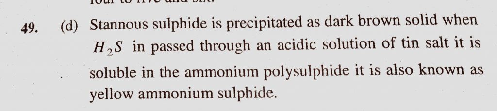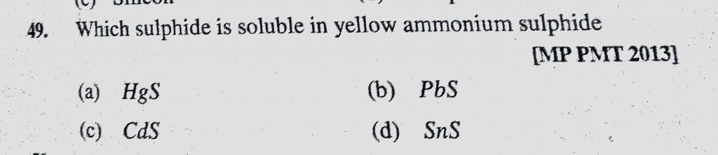 Which sulphide is soluble in yellow ammonium sulphide (a) HgS (b) PbS (c) CdS (d) SnS Which sulphide is soluble in yellow ammonium sulphide (a) HgS (b) PbS (c) CdS (d) SnS November 18, 2020 Category: Uncategorised (JEE Advanced Physics by BM Sharma + GMP Solutions) , Facebook Messenger WhatsApp Share this:TwitterFacebook Related