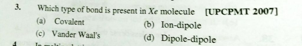 Which type of bond is present in Xe molecule (a) Covalent (b) Ion – dipole (C) Vander waal’s (d) Dipole – dipole Which type of bond is present in Xe molecule (a) Covalent (b) Ion - dipole (C) Vander waal's (d) Dipole - dipole December 9, 2020 Category: Uncategorised (JEE Advanced Physics by BM Sharma + GMP Solutions) , Facebook Messenger WhatsApp Share this:TwitterFacebook Related