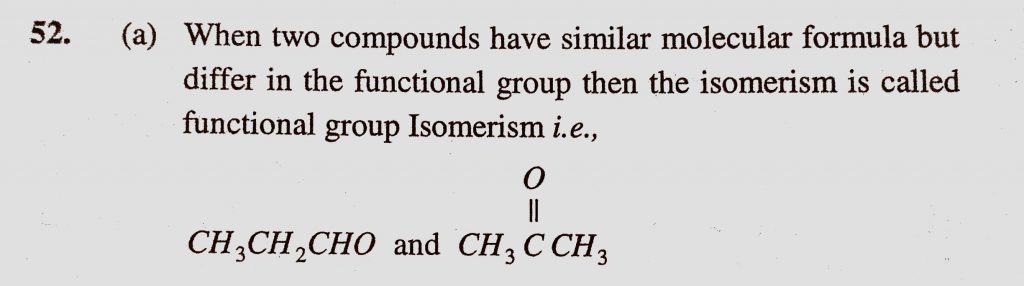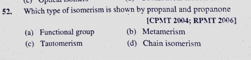 Which type of isomerism is shown by propanal and propanone (a) Functional group (b) Metamerism (c) Tautomerism (d) Chain isomerism Which type of isomerism is shown by propanal and propanone (a) Functional group (b) Metamerism (c) Tautomerism (d) Chain isomerism December 10, 2020 Category: Uncategorised (JEE Advanced Physics by BM Sharma + GMP Solutions) , Facebook Messenger WhatsApp Share this:TwitterFacebook Related