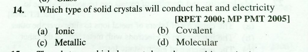 Which type of solid crystals will conduct heat and electricity (a) Ionic (b) Covalent (c) Metallic (d) Molecular Which type of solid crystals will conduct heat and electricity (a) Ionic (b) Covalent (c) Metallic (d) Molecular February 8, 2021 Category: Uncategorised (JEE Advanced Physics by BM Sharma + GMP Solutions) , Facebook Messenger WhatsApp Share this:TwitterFacebook Related