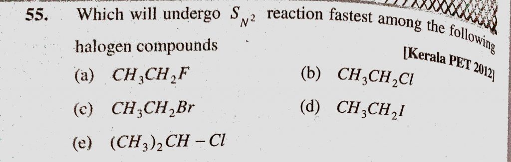 Which will undergo SN2 reaction fastest among the following halogen compounds (a) CH3CH2F (b) CH3CH2Cl (c) CH3CH2Br (d) CH3CH2I Which will undergo SN2 reaction fastest among the following halogen compounds (a) CH3CH2F (b) CH3CH2Cl (c) CH3CH2Br (d) CH3CH2I February 8, 2021 Category: Uncategorised (JEE Advanced Physics by BM Sharma + GMP Solutions) , Facebook Messenger WhatsApp Share this:TwitterFacebook Related