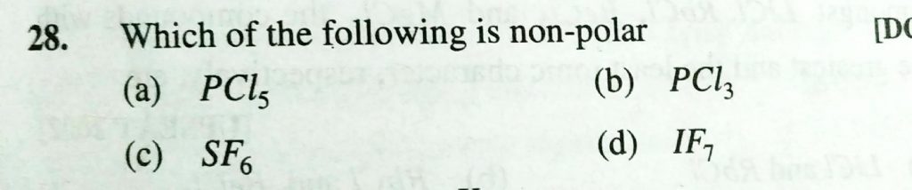 Whichy of the following is non – polar (a) PCL5 (b) PCl3 (c) SF6 (d) IF7 Whichy of the following is non - polar (a) PCL5 (b) PCl3 (c) SF6 (d) IF7 December 2, 2020 Category: Uncategorised (JEE Advanced Physics by BM Sharma + GMP Solutions) , Facebook Messenger WhatsApp Share this:TwitterFacebook Related
