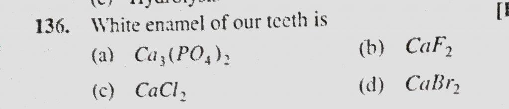 White enamel of our teeth is (a) Ca3(PO4)2 (b) CaF2 (c) CaCl2 (d) CaBr2 White enamel of our teeth is (a) Ca3(PO4)2 (b) CaF2 (c) CaCl2 (d) CaBr2 November 24, 2020 Category: Uncategorised (JEE Advanced Physics by BM Sharma + GMP Solutions) , Facebook Messenger WhatsApp Share this:TwitterFacebook Related