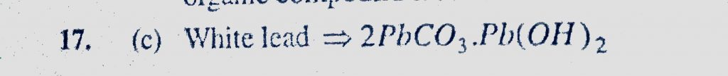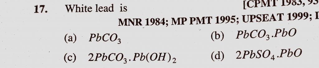 White lead is (a) PbCO3 (b) PbCO3.PbO (c) 2PbCO3.Pb(OH)2 (d) 2PbSO4.PbO White lead is (a) PbCO3 (b) PbCO3.PbO (c) 2PbCO3.Pb(OH)2 (d) 2PbSO4.PbO November 17, 2020 Category: Uncategorised (JEE Advanced Physics by BM Sharma + GMP Solutions) , Facebook Messenger WhatsApp Share this:TwitterFacebook Related