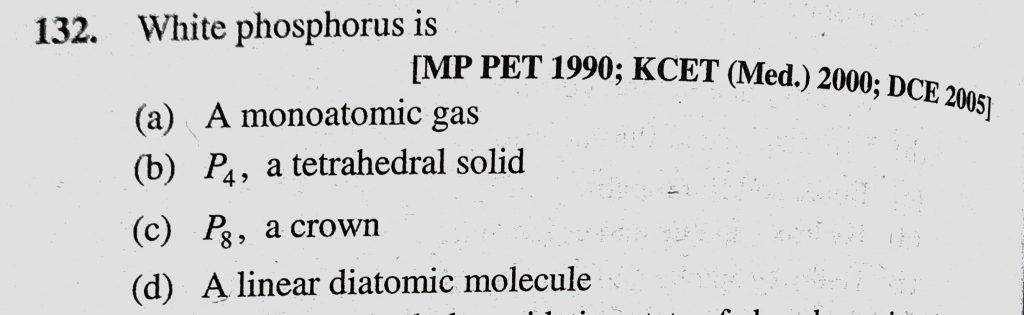 White phosphorus is (a) A monoatomic gas (b) P4, a tetrahedral solid (c) P8, a crown (d) A linear diatomic molecule a crown (d) A linear diatomic molecule a tetrahedral solid (c) P8 White phosphorus is (a) A monoatomic gas (b) P4 November 23, 2020 Category: Uncategorised (JEE Advanced Physics by BM Sharma + GMP Solutions) , Facebook Messenger WhatsApp Share this:TwitterFacebook Related