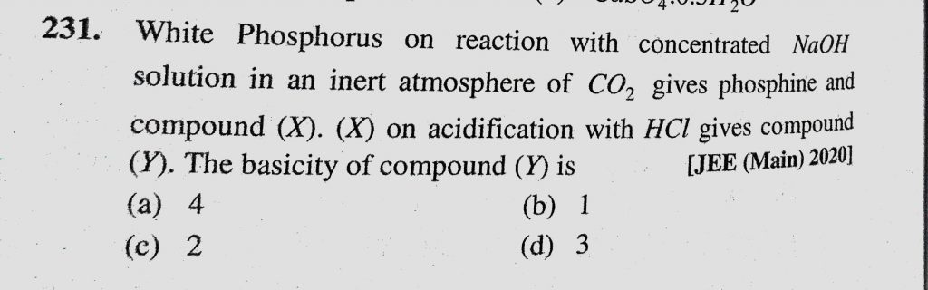 White phosphorus on reaction with concentrated NaOH solution in an inert atmosphere of CO2 gives phosphine and compound (X). (X) on acidification with HCl gives compound White phosphorus on reaction with concentrated NaOH solution in an inert atmosphere of CO2 gives phosphine and compound (X). (X) on acidification with HCl gives compound November 28, 2020 Category: Uncategorised (JEE Advanced Physics by BM Sharma + GMP Solutions) , Facebook Messenger WhatsApp Share this:TwitterFacebook Related