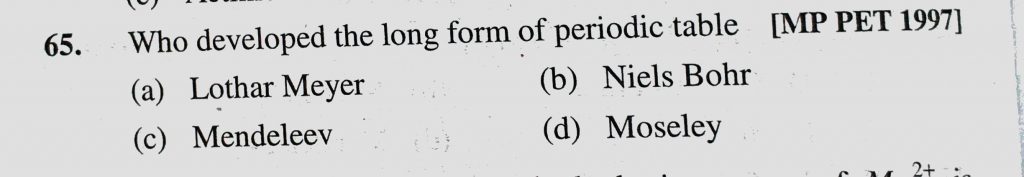 Who developed the long form of periodic table (a) Lothar Meyer (b) Niels Bohr (c) Mendeleev (d) Moseley Who developed the long form of periodic table (a) Lothar Meyer (b) Niels Bohr (c) Mendeleev (d) Moseley November 8, 2020 Category: Uncategorised (JEE Advanced Physics by BM Sharma + GMP Solutions) , Facebook Messenger WhatsApp Share this:TwitterFacebook Related