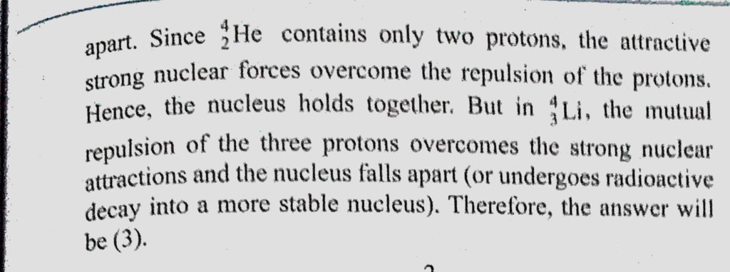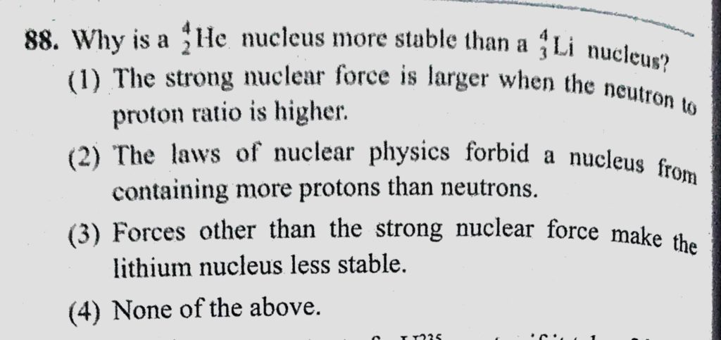Why is a 4He2 nucleus more stable than a 4Li3 nucleus ? (1) The strong nuclear force is larger when the neutron to proton ratio is higher. (2) The laws of nuclear physics forbid a Why is a 4He2 nucleus more stable than a 4Li3 nucleus ? (1) The strong nuclear force is larger when the neutron to proton ratio is higher. (2) The laws of nuclear physics forbid a October 18, 2020 Category: Uncategorised (JEE Advanced Physics by BM Sharma + GMP Solutions) , Facebook Messenger WhatsApp Share this:TwitterFacebook Related