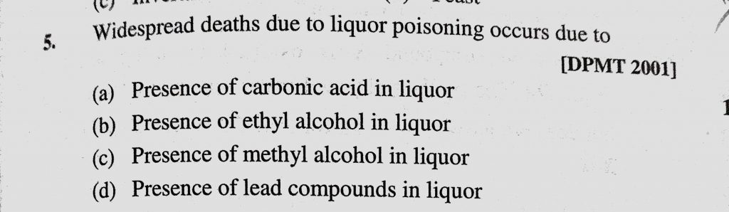 Widespread deaths due to liquor poisoning occurs due to (a) Presence of carbonic acid in liquor (b) Presence of ethyl alcohol in liquor (c) Presence of methyl alcohol in liquor Widespread deaths due to liquor poisoning occurs due to (a) Presence of carbonic acid in liquor (b) Presence of ethyl alcohol in liquor (c) Presence of methyl alcohol in liquor February 11, 2021 Category: Uncategorised (JEE Advanced Physics by BM Sharma + GMP Solutions) , Facebook Messenger WhatsApp Share this:TwitterFacebook Related