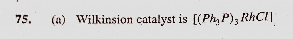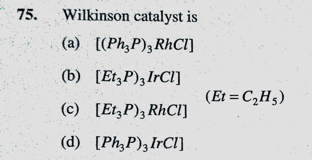 Wilkinson catalyst is (a) ((Ph3P)3 RhCl) (b) (Et3P)3 IrCl) (c) (Et3P)3 RhCl) (d) (Ph3P)3 IrCl) Wilkinson catalyst is (a) ((Ph3P)3 RhCl) (b) (Et3P)3 IrCl) (c) (Et3P)3 RhCl) (d) (Ph3P)3 IrCl) December 5, 2020 Category: Uncategorised (JEE Advanced Physics by BM Sharma + GMP Solutions) , Facebook Messenger WhatsApp Share this:TwitterFacebook Related