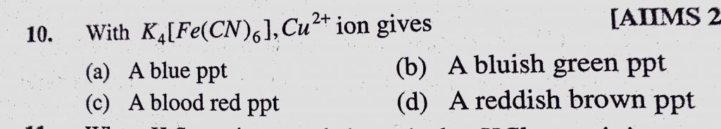 With K4(Fe(CN)6), Cu 2+ ion gives (a) A blue ppt (b) A bluish green ppt (c) A blood red ppt (d) A reddish brown ppt Cu 2+ ion gives (a) A blue ppt (b) A bluish green ppt (c) A blood red ppt (d) A reddish brown ppt With K4(Fe(CN)6) December 6, 2020 Category: Uncategorised (JEE Advanced Physics by BM Sharma + GMP Solutions) , Facebook Messenger WhatsApp Share this:TwitterFacebook Related