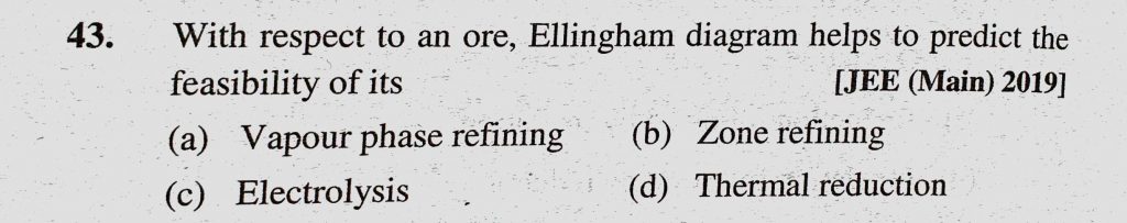 With respect to an ore, Ellingham diagram helps to predict the feasibility of its (a) Vapour phase refining (b) Zone refining (c) Electrolysis Ellingham diagram helps to predict the feasibility of its (a) Vapour phase refining (b) Zone refining (c) Electrolysis With respect to an ore November 12, 2020 Category: Uncategorised (JEE Advanced Physics by BM Sharma + GMP Solutions) , Facebook Messenger WhatsApp Share this:TwitterFacebook Related