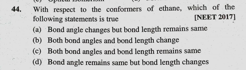 With respect to the conformers of ethane, which of the following statements is true (a) Bond angle changes but bond length remains same (b) Both bond angles and bond length change which of the following statements is true (a) Bond angle changes but bond length remains same (b) Both bond angles and bond length change With respect to the conformers of ethane December 10, 2020 Category: Uncategorised (JEE Advanced Physics by BM Sharma + GMP Solutions) , Facebook Messenger WhatsApp Share this:TwitterFacebook Related