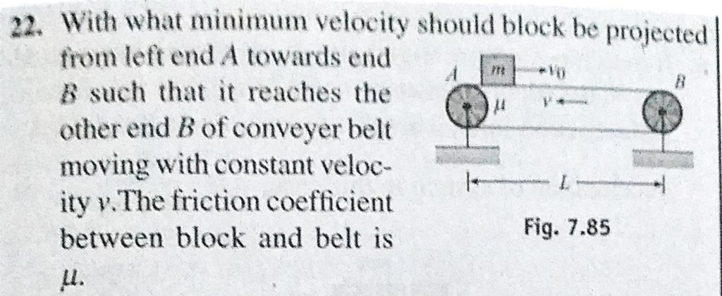 With what minimum velocity should block be projected from left end A towards end B such that it reaches the other end B of conveyer belt moving with constant velocity v. The frictiion coefficient With what minimum velocity should block be projected from left end A towards end B such that it reaches the other end B of conveyer belt moving with constant velocity v. The frictiion coefficient September 30, 2020 Category: Uncategorised (JEE Advanced Physics by BM Sharma + GMP Solutions) , Facebook Messenger WhatsApp Share this:TwitterFacebook Related