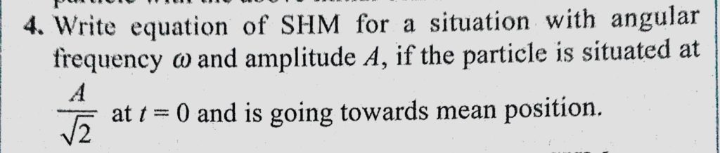 Write equation of SHM for a situation with angular frequency omega and amplitude A, if the particle is situated at A/root 2 at t = 0 and is going towards mean position. if the particle is situated at A/root 2 at t = 0 and is going towards mean position. Write equation of SHM for a situation with angular frequency omega and amplitude A October 30, 2020 Category: Uncategorised (JEE Advanced Physics by BM Sharma + GMP Solutions) , Facebook Messenger WhatsApp Share this:TwitterFacebook Related