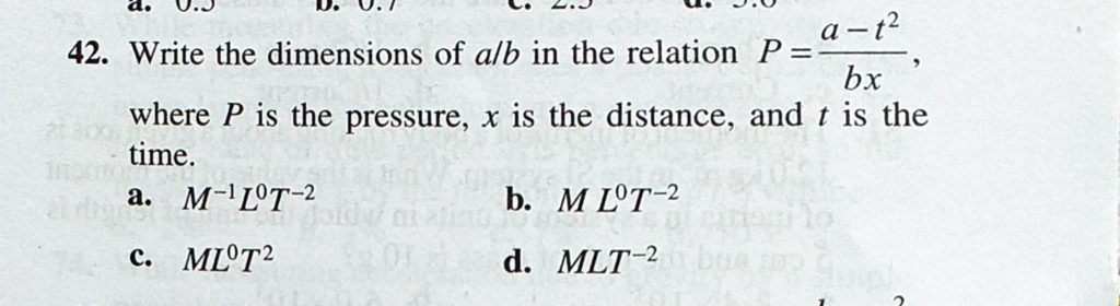 Write the dimensions of a/b in the relation P = a – t^2/bx, where P is the pressure, x is the distance, and t is the time. and t is the time. where P is the pressure Write the dimensions of a/b in the relation P = a - t^2/bx x is the distance September 15, 2020 Category: Uncategorised (JEE Advanced Physics by BM Sharma + GMP Solutions) , Facebook Messenger WhatsApp Share this:TwitterFacebook Related