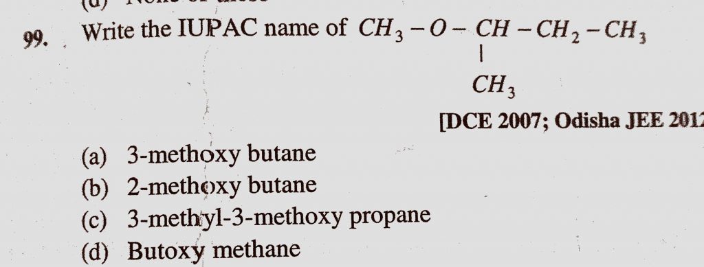 Write the IUPAC name of (a) 3-methoxy butane (b) 2-methoxy butane (c) 3-methyl-3-methoxy propane Write the IUPAC name of (a) 3-methoxy butane (b) 2-methoxy butane (c) 3-methyl-3-methoxy propane December 11, 2020 Category: Uncategorised (JEE Advanced Physics by BM Sharma + GMP Solutions) , Facebook Messenger WhatsApp Share this:TwitterFacebook Related
