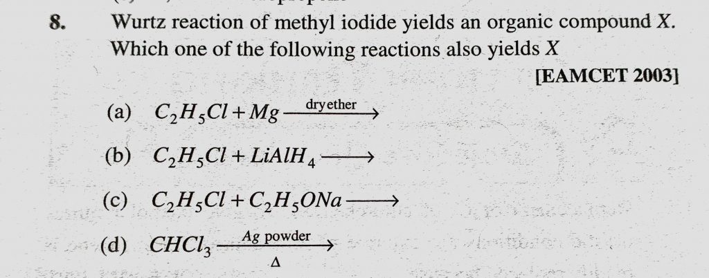 Wurtz reaction of methyl iodide yields an organic compound X. Which one of the following reactions also yields X Wurtz reaction of methyl iodide yields an organic compound X. Which one of the following reactions also yields X February 9, 2021 Category: Uncategorised (JEE Advanced Physics by BM Sharma + GMP Solutions) , Facebook Messenger WhatsApp Share this:TwitterFacebook Related