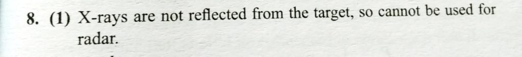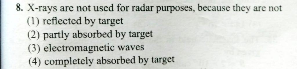 X – rays are not used radar purpose, because they are not (1) reflected by target ( 2) partly absorbed by target (3) electromagnetic waves (4) completely absorbed by target because they are not (1) reflected by target ( 2) partly absorbed by target (3) electromagnetic waves (4) completely absorbed by target X - rays are not used radar purpose October 28, 2020 Category: Uncategorised (JEE Advanced Physics by BM Sharma + GMP Solutions) , Facebook Messenger WhatsApp Share this:TwitterFacebook Related