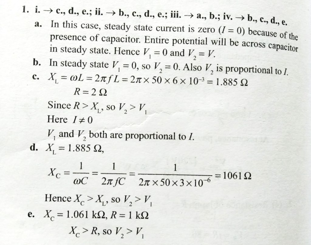 You are given many resistance, capacitors and inductors. These are connected to variable DC voltage source (the first two circuits) or an AC voltage source of 50 Hz frequency (the next three circuits) in different ways as shown in column II. When a current (steady state for DC or rms for AC) flows through the circuit , the corrresponding voltage V1 and V2 . (indicated in circuit) are related as shown in column I . match the two