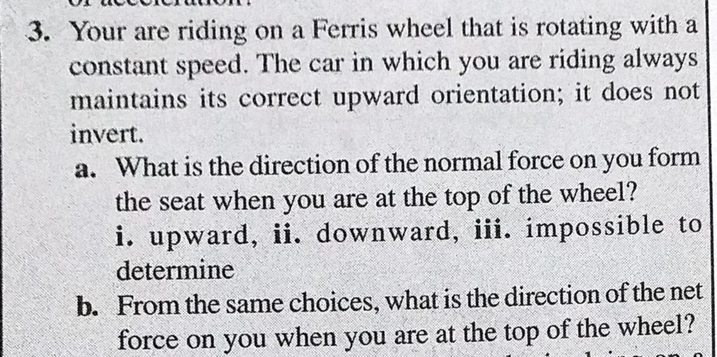 Your are riding on a Ferris wheel that is rotating with a constant speed. The car in which you are riding always maintains its correct upward orientation; it does not invert. Your are riding on a Ferris wheel that is rotating with a constant speed. The car in which you are riding always maintains its correct upward orientation; it does not invert. September 30, 2020 Category: Uncategorised (JEE Advanced Physics by BM Sharma + GMP Solutions) , Facebook Messenger WhatsApp Share this:TwitterFacebook Related