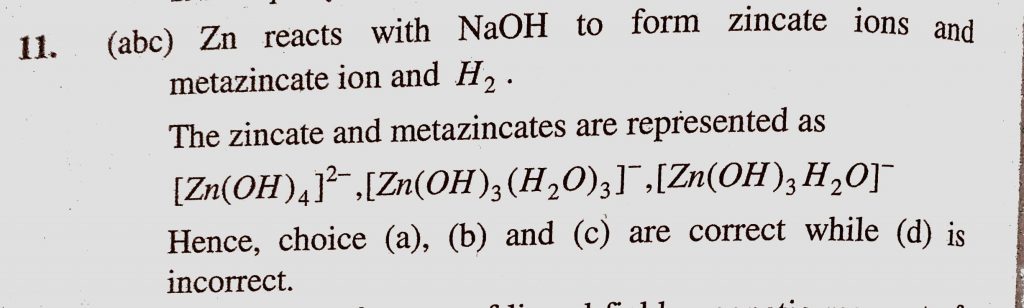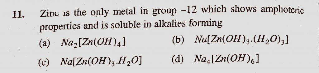 Zinc is the only metal in group -12 which shows amphoteric properties and is soluble in alkalies forming (a) Na2(Zn(OH)4) (b) Na(Zn(OH)3.(H2O)3) Zinc is the only metal in group -12 which shows amphoteric properties and is soluble in alkalies forming (a) Na2(Zn(OH)4) (b) Na(Zn(OH)3.(H2O)3) December 6, 2020 Category: Uncategorised (JEE Advanced Physics by BM Sharma + GMP Solutions) , Facebook Messenger WhatsApp Share this:TwitterFacebook Related
