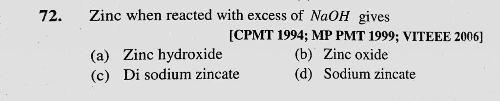 Zinc when reacted with excess of NaOH gives (a) Zinc hydroxide (b) Zinc oxide (c) Di sodium zincate (d) Sodium zincate Zinc when reacted with excess of NaOH gives (a) Zinc hydroxide (b) Zinc oxide (c) Di sodium zincate (d) Sodium zincate December 1, 2020 Category: Uncategorised (JEE Advanced Physics by BM Sharma + GMP Solutions) , Facebook Messenger WhatsApp Share this:TwitterFacebook Related