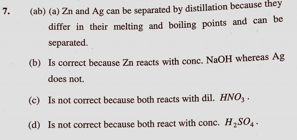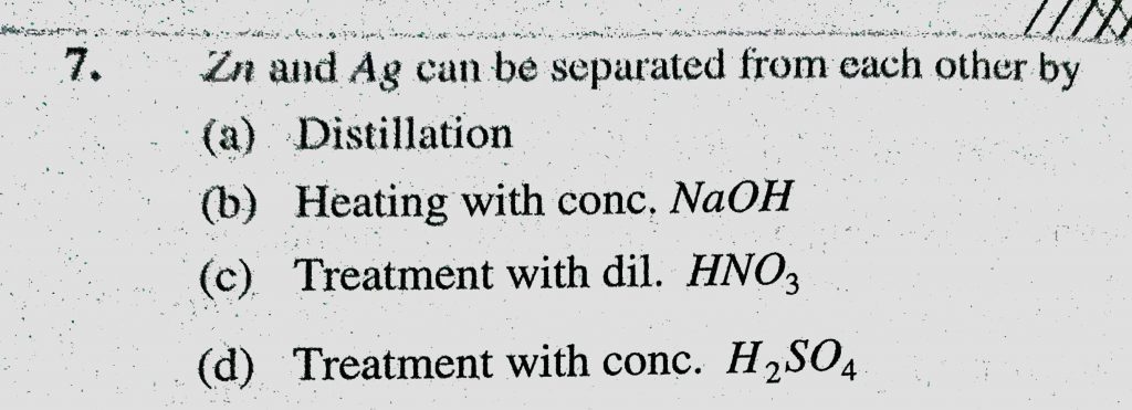 Zn and Ag can be separated from each other by (a) Distillation (b) Heating with conc. NaOH (c) Treatment with dil. HNO3 Zn and Ag can be separated from each other by (a) Distillation (b) Heating with conc. NaOH (c) Treatment with dil. HNO3 December 6, 2020 Category: Uncategorised (JEE Advanced Physics by BM Sharma + GMP Solutions) , Facebook Messenger WhatsApp Share this:TwitterFacebook Related